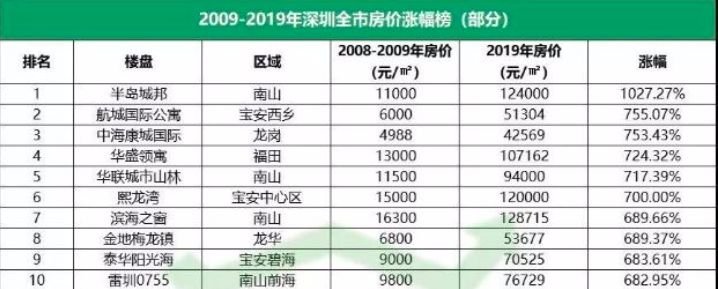 无独有偶,在过去10年深圳上涨最多的小区也是完全没有统一的规律,小区排行榜上即有南山,福田这种关内CBD地段;也有像龙华,宝安这种待开发还在成熟阶段的地区。