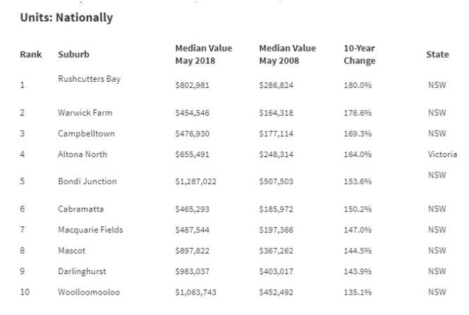 这一幅房价增长统计表,上面罗列整个澳洲过去10年公寓价格增长最快的10大区域。