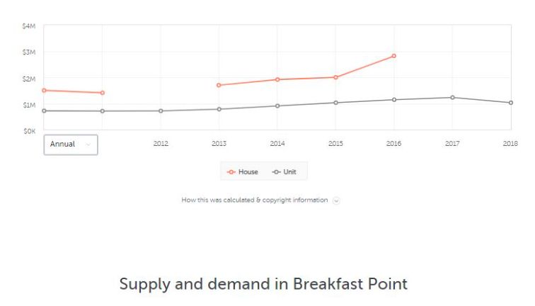 以上两张图是Breakfast Point与 Campbelltown2010-2018的公寓中价位价格走势图。